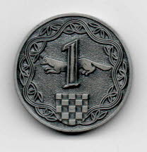 - 25 Banica, 23,3 mm : 50 years of Sandžak annexion - 50 Banica, 24,3 mm : Croatian warrior - 1 Kuna, 25,7 mm : Handžar - 1 Kuna, 25,7 mm : Coat of arms of Handžar, Kama and Prinz Eugen - 2 Kuna, 28,0 mm : HOS - 2 Kuna, 28,0 mm : Croatian State Labour Service - 5 Kuna, 30,0 mm : Marija Orić - 5 Kuna, 30,0 mm : Frane Tente - 10 Kuna, 32,0 mm : Beware of Četniks and Partisans - 10 Kuna, 32,0 mm : Black Legion and Jure Francetić - 50 Kuna, 39,0 mm : Poglavnik Dr. Ante Pavelić